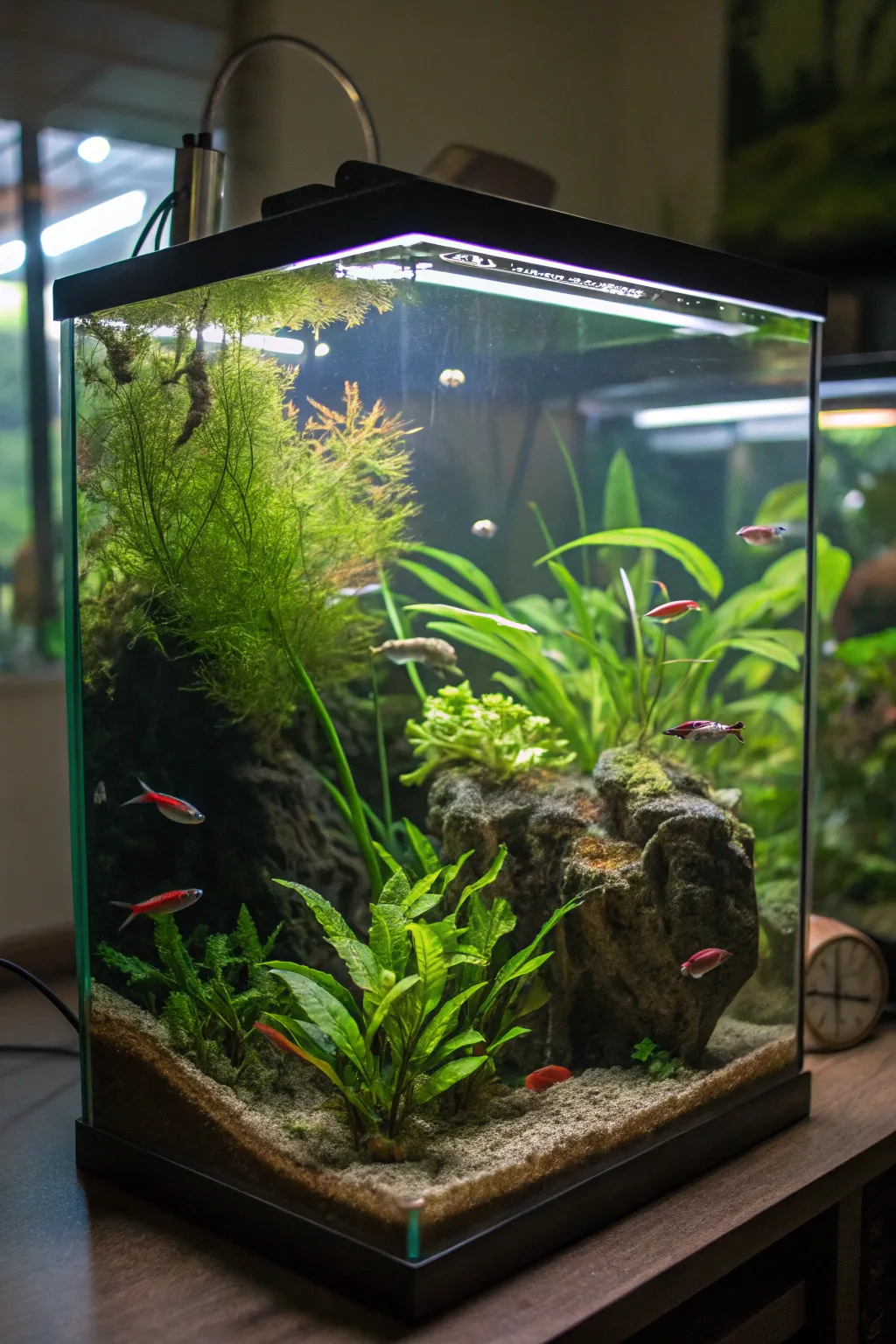Establish a micro jungle using thick plantings and small fish. This design is like a tiny excursion waiting to be explored every time you glance at it.