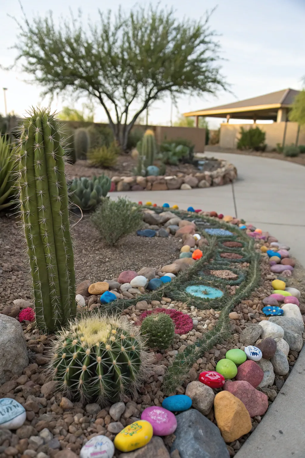 - Stones with Designs: Use these painted stones to brighten up your cactus display and show off your outdoor creativity.