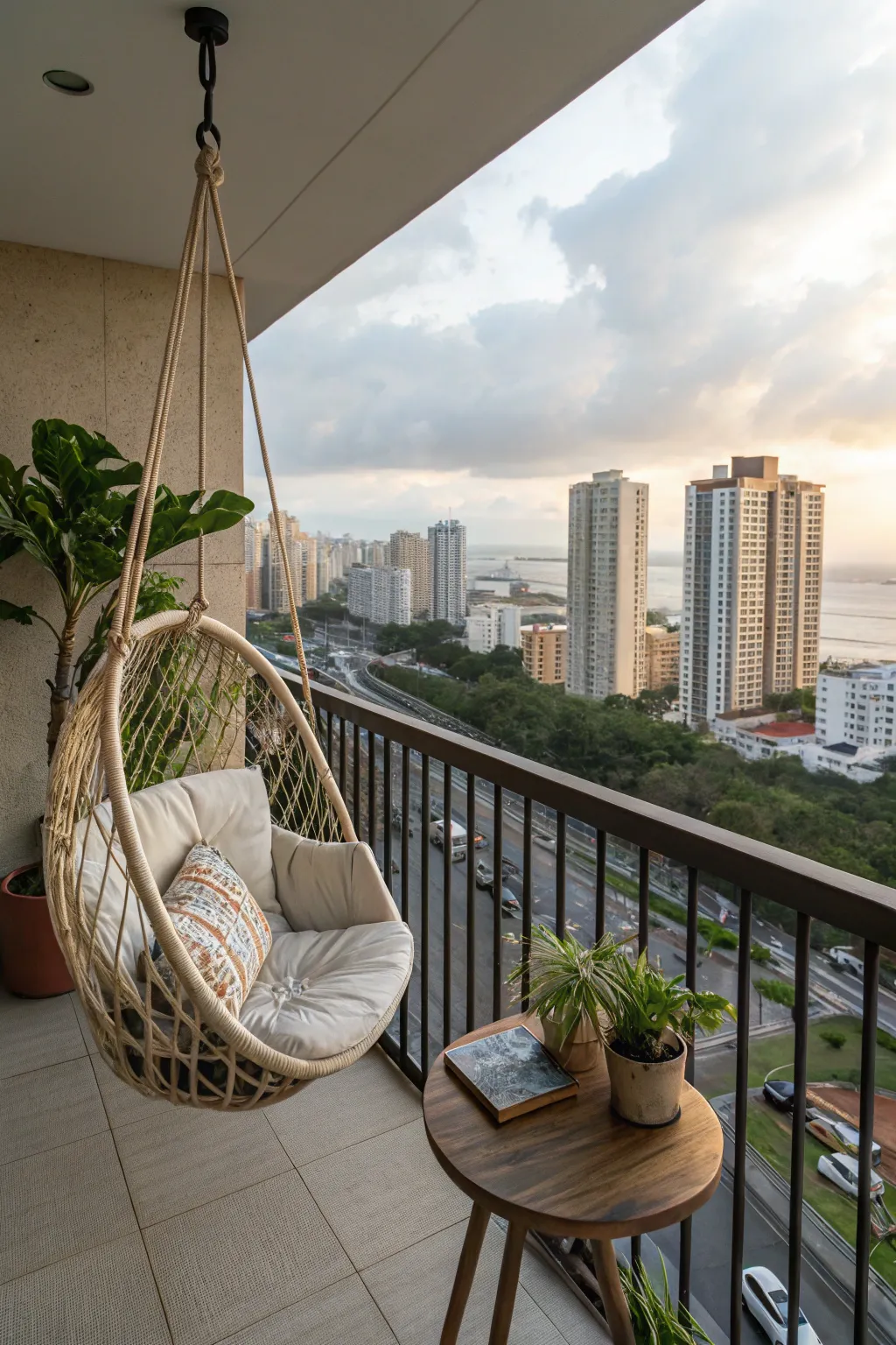 - Wicker Hanging Seat with Cushions: Add charm and comfort to your balcony with this cozy wicker seat and plush cushions.