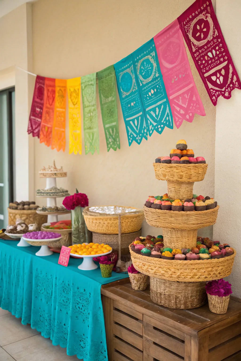 Elevate your candy buffet with a themed backing showcasing Mexican patterns or imagery. It’s the ideal way to bring the whole presentation together.