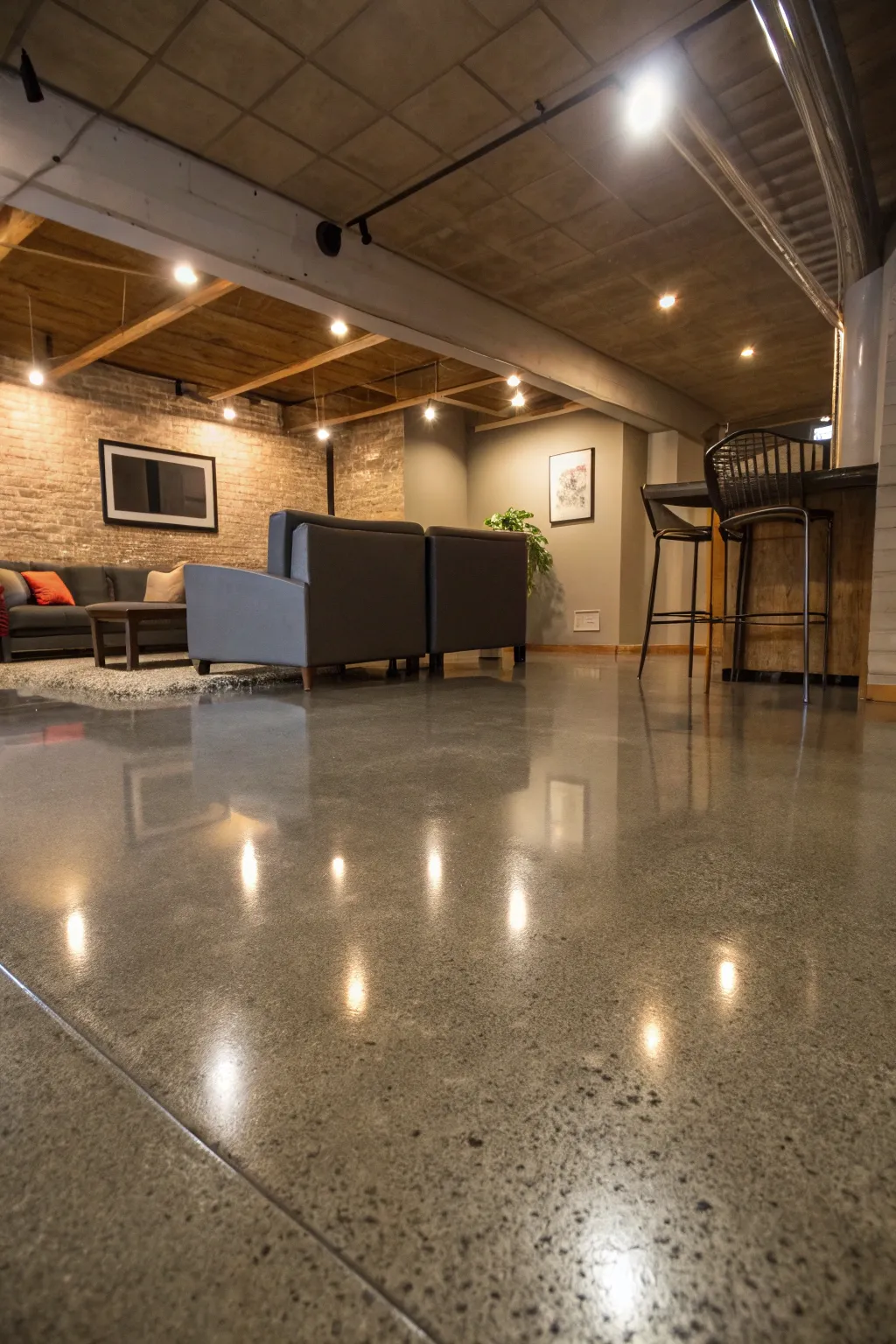 For basements with more than one level, make sure the change between floors is smooth with concrete finishes that match. This design makes the space feel connected.