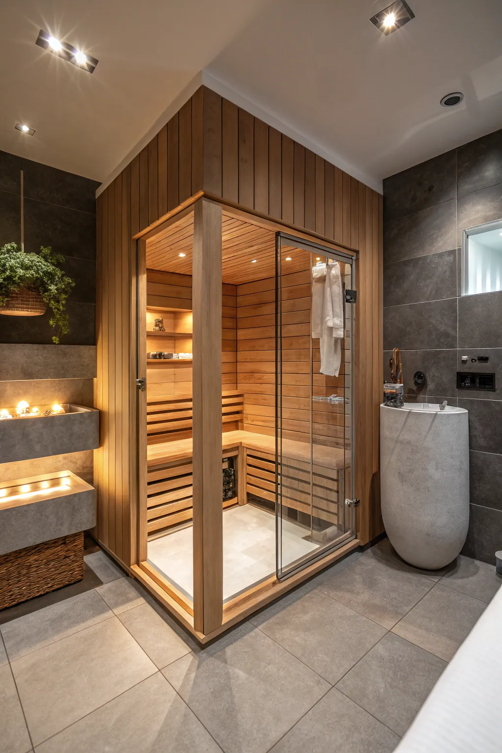 Think about adding a corner sauna for a genuine getaway. I’ve discovered that even a small sauna can be a luxurious escape that greatly improves your bathroom experience.
