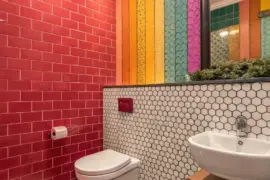 Incorporate unexpected color highlights to help your bathroom really pop. I like using vibrant shades in smaller amounts to contribute energy and personality without overwhelming the area.