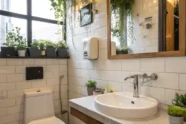 • Adhesive Tile Backsplash: Update your bathroom conveniently through adhesive tiles, ideal for a dramatic emphasized wall.