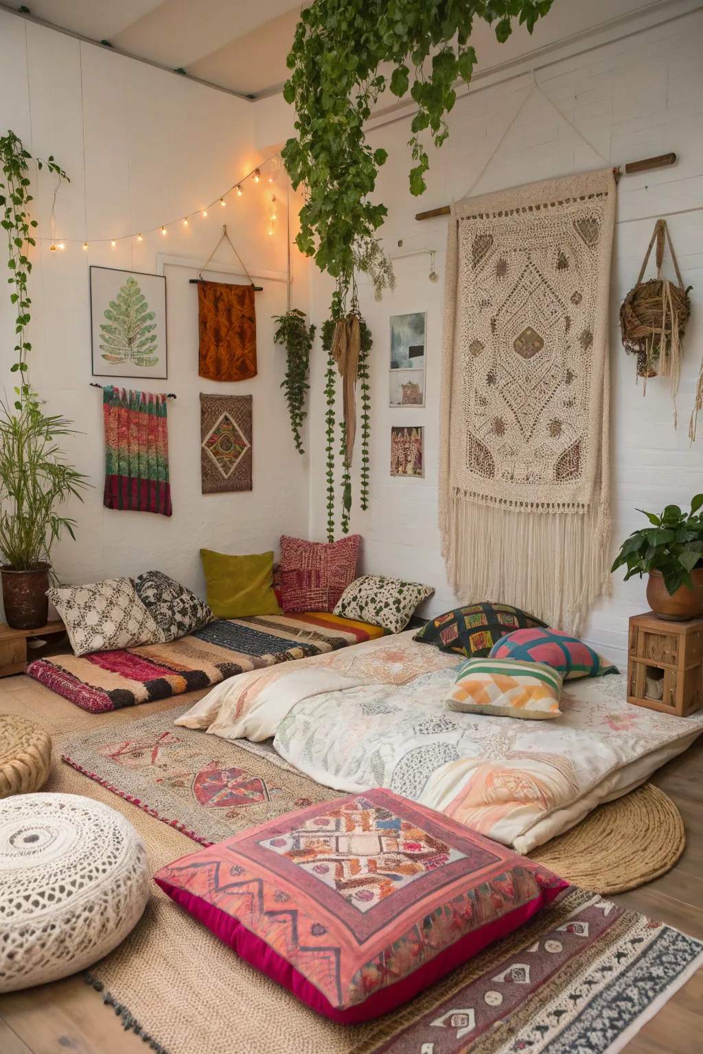 Get a bohemian look by layering textured materials and diverse decor around your floor bed. In my experience, combining patterns and colors creates a welcoming and warm space.