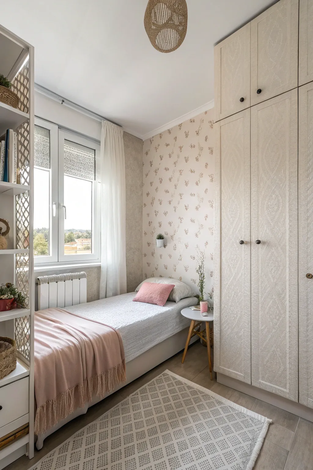- Textured Wall Covering: Add depth and elegance to your small bedroom with easy-to-install textured wallpaper.