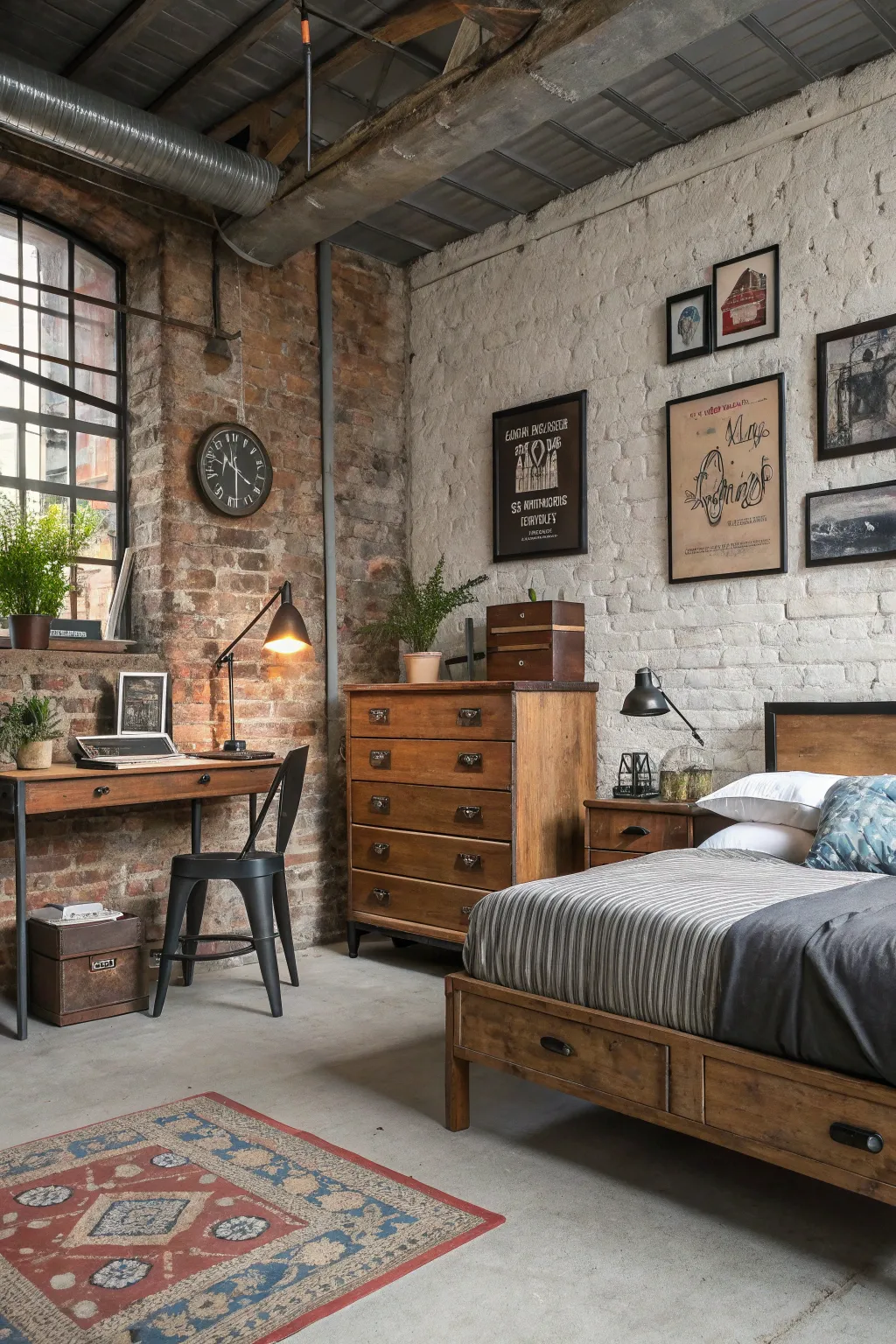 Distinctive decor pieces infuse character into this industrial bedroom.