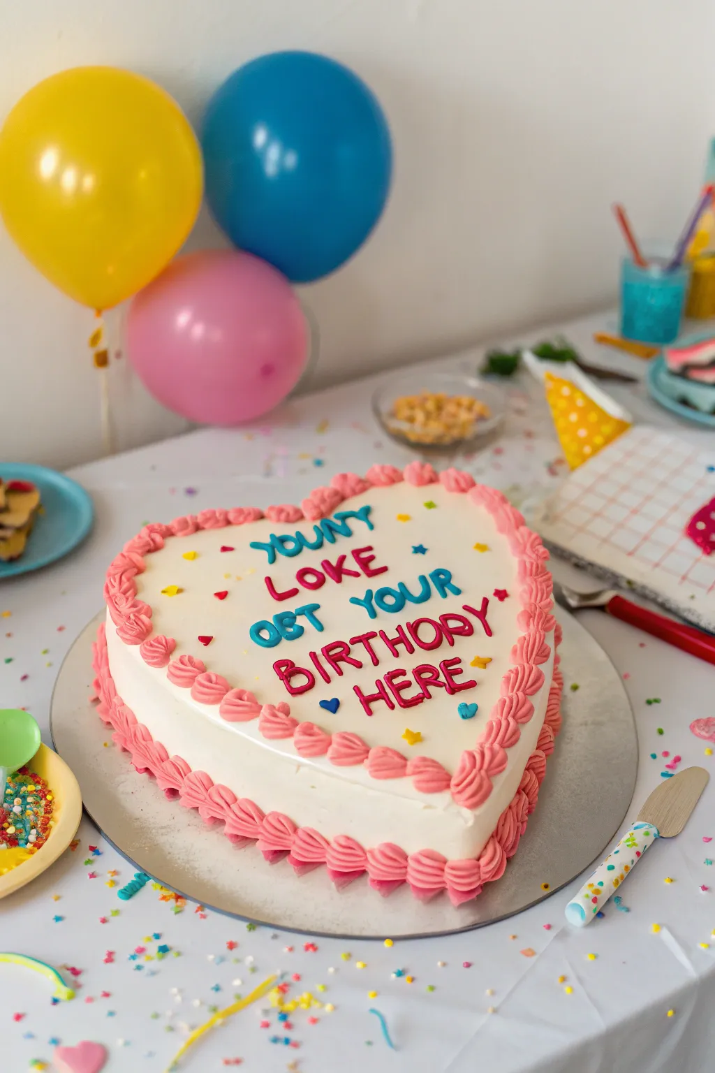 Shape the cake as a heart with a fun message, ‘Old timer, young at heart,’ celebrating the youthful attitude. I’ve seen this cake bring smiles and fond memories at numerous parties.