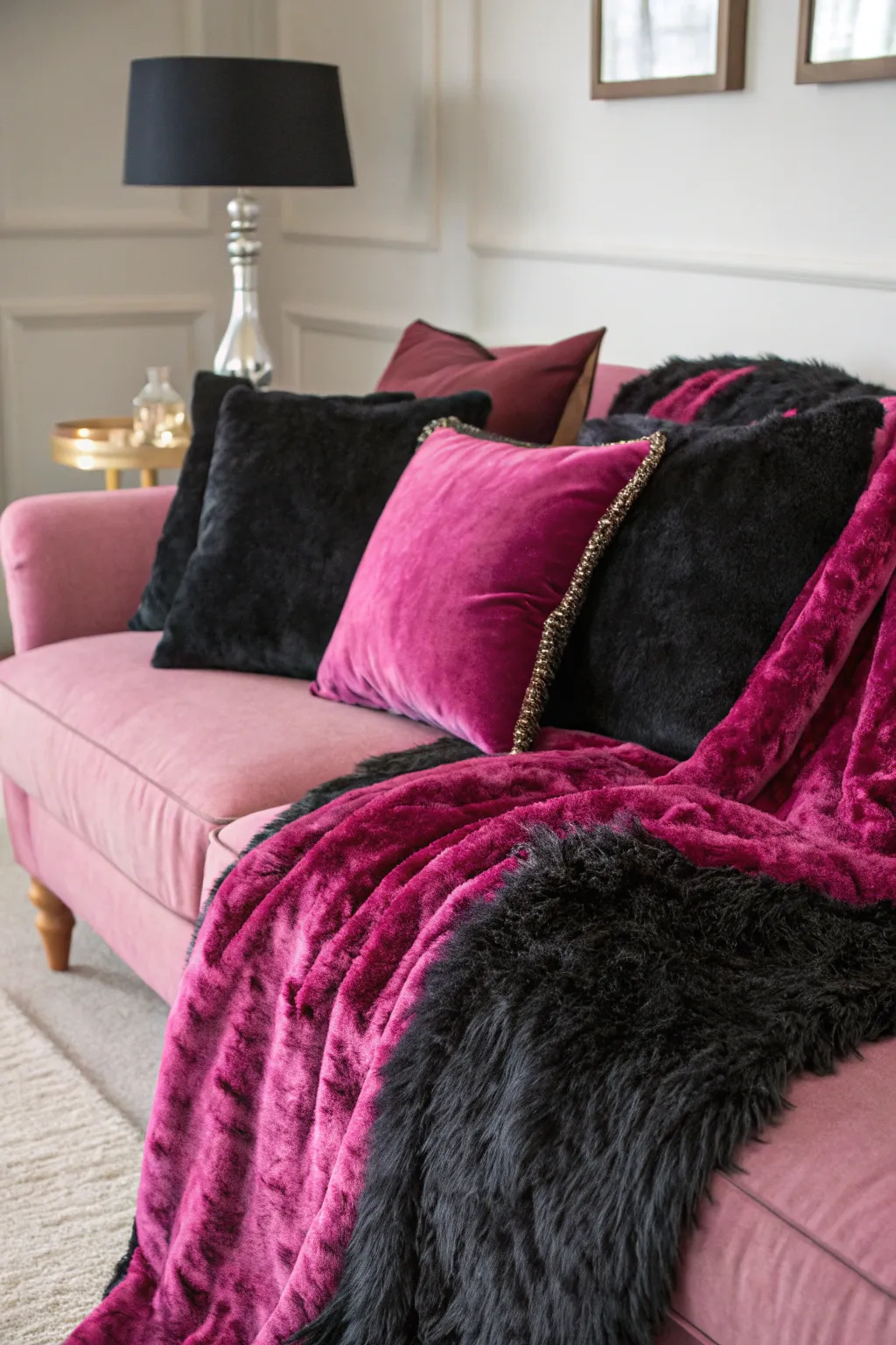Begin with a noticeable color contrast by using deep black alongside lively pink for a striking effect. I’ve observed that this kind of contrast can transform a room’s vibe and bring in drama without taking over the entire space.