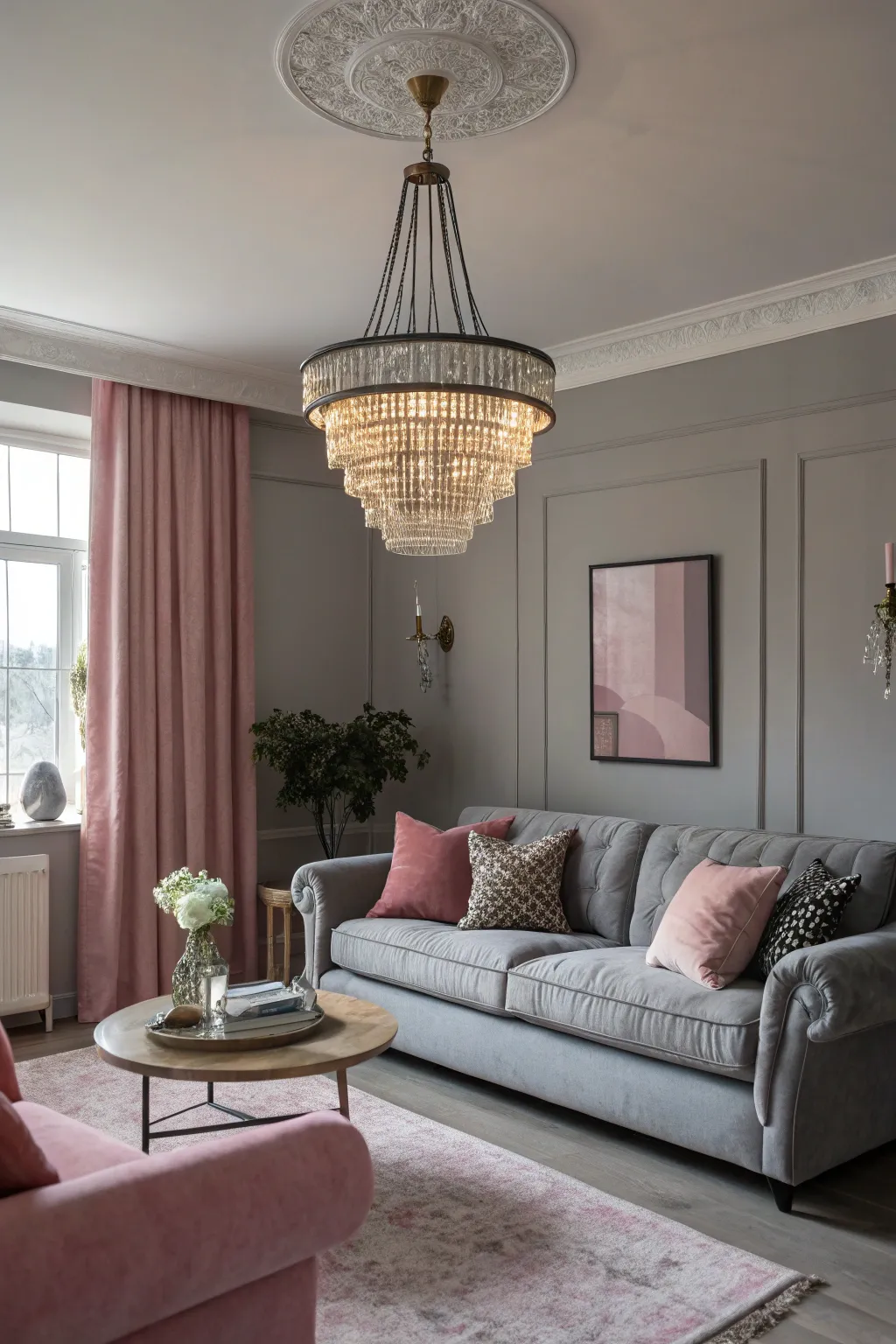 Begin with a gray sectional as the centerpiece, then incorporate rose cushions for a delicate contrast. This pairing provides an inviting and elegant ambiance that’s always well-received.