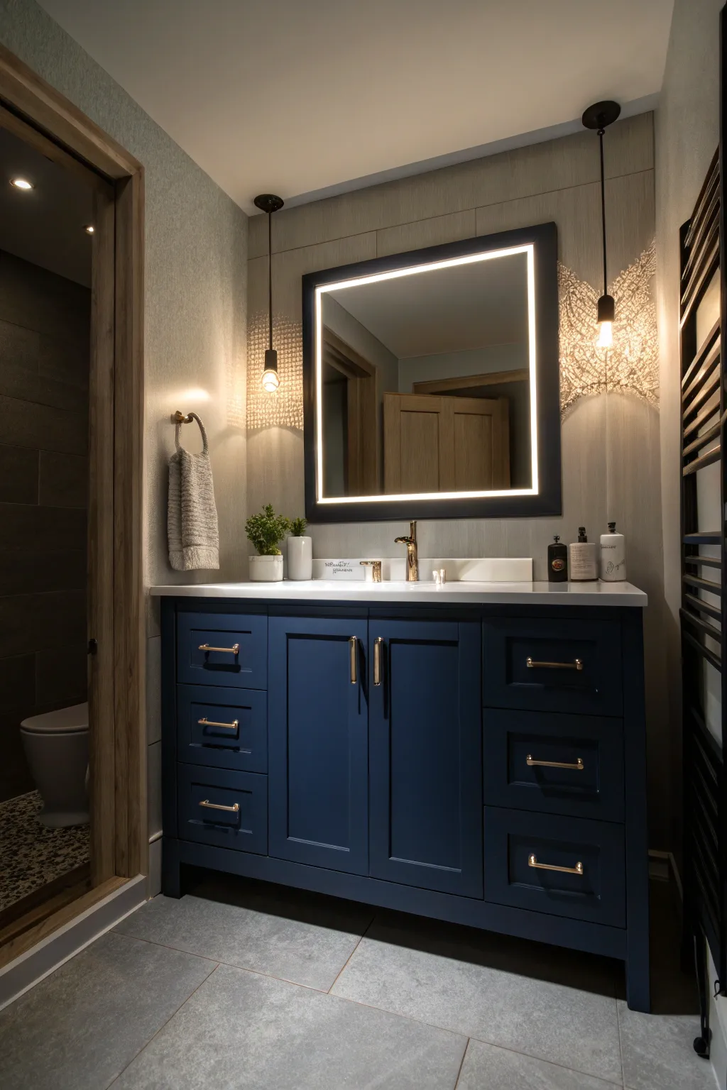 Opt for ornate reflective glass components over a deep sea blue vanity for a touch of vintage appeal. It’s like stepping into a classic film set every time you enter your bathroom.