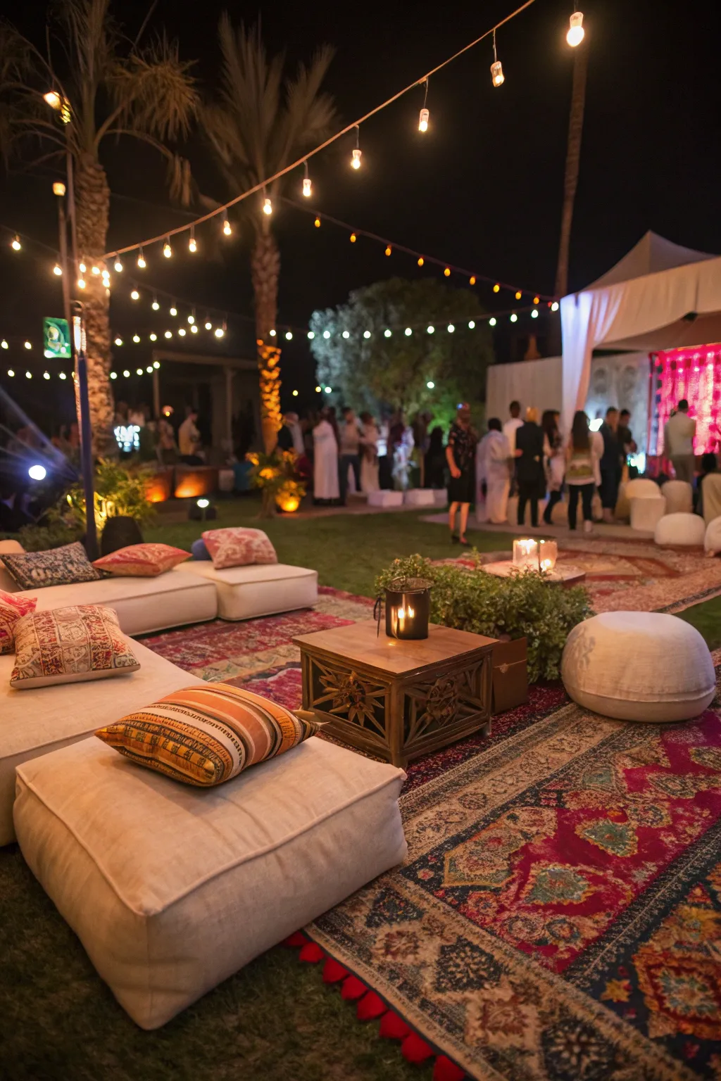 Design welcoming seating areas with floor cushions and carpets. This arrangement isn’t just fashionable; it’s also exceptionally cozy, offering your guests the perfect spot to unwind and relish the party.
