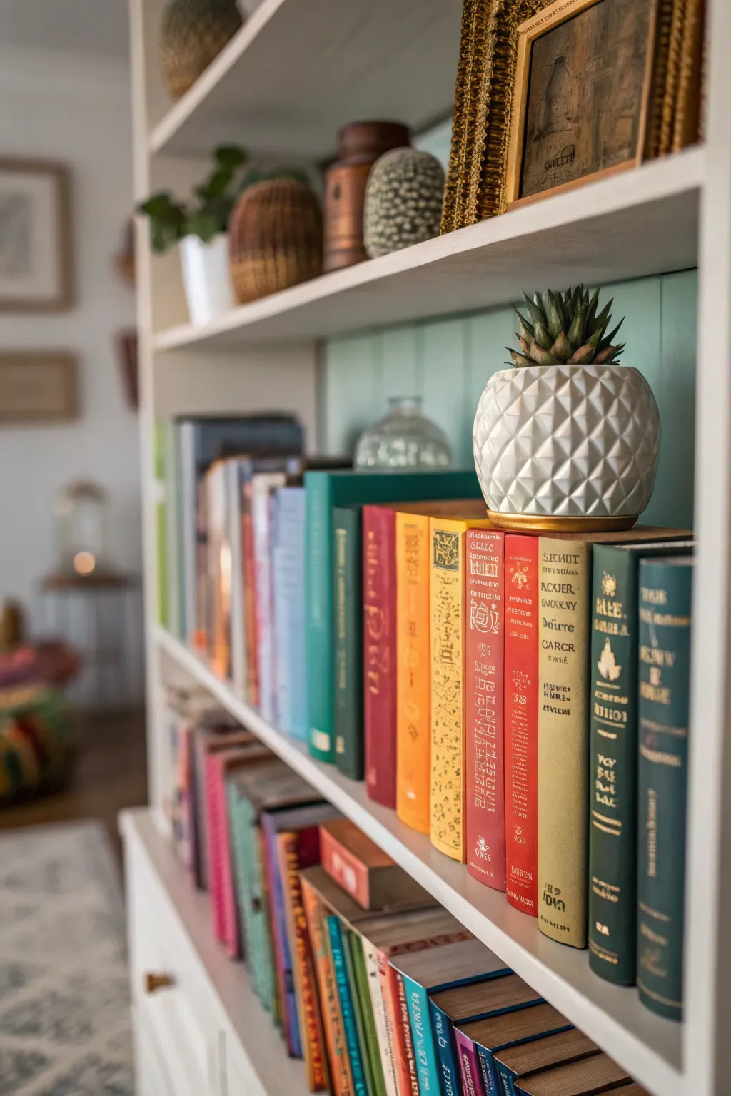 Organizing books by color can transform your shelf into a work of art. I love how it adds a sense of order and vibrancy to the room effortlessly.