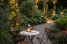 Drape filament lighting across your patio for an enchanting evening atmosphere. In my area, the gentle glow of lights transforms the patio into a cozy retreat post-sunset.