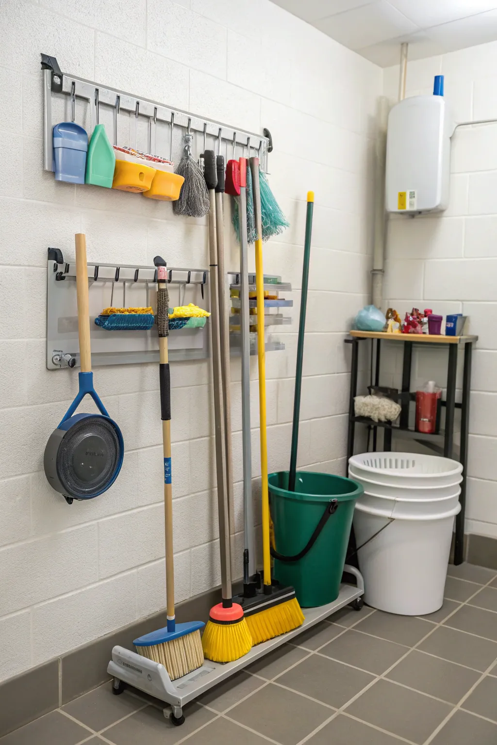 I am a big fan of combination racks that can hold mops, brooms, and other cleaning products. These racks help keep everything together, minimizing clutter.