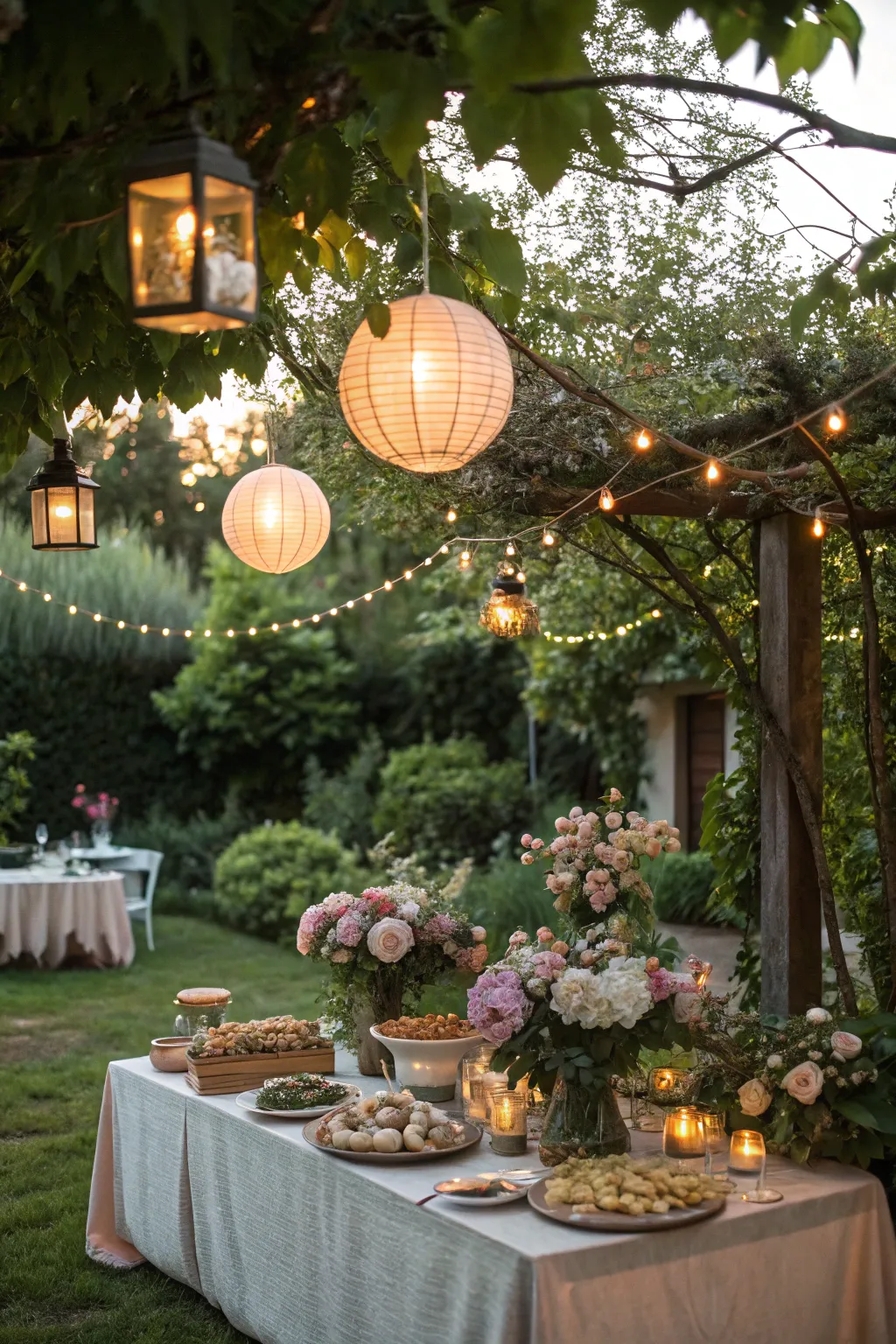 Transform your outdoor area into a boho haven with a few straightforward additions. Incorporate fairy lights and handwoven lamps to conjure a captivating atmosphere that transports your attendees to an idyllic garden setting.