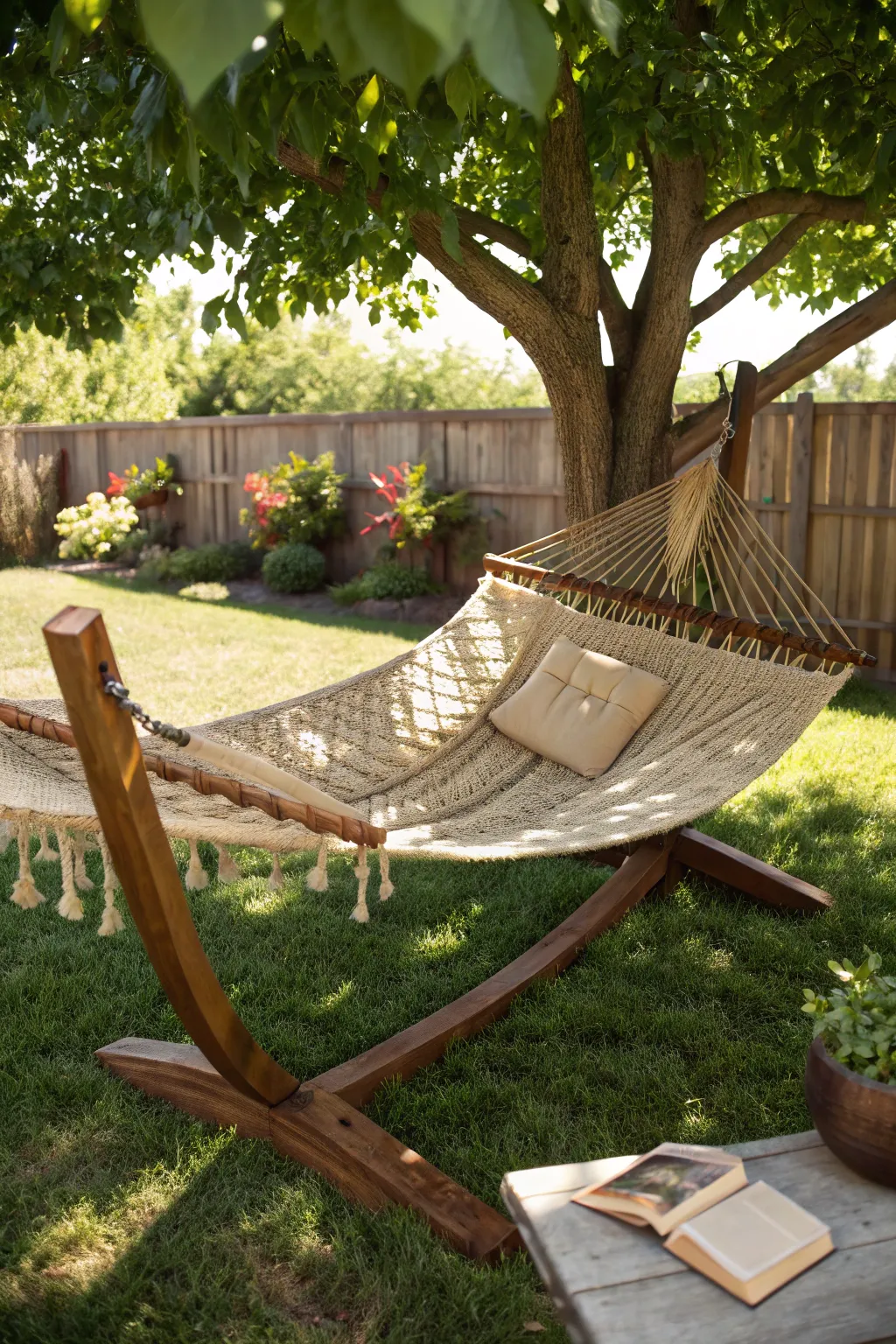 A hammock is an affordable addition that brings relaxation. It’s my favorite spot to relax with a book under the shade.
