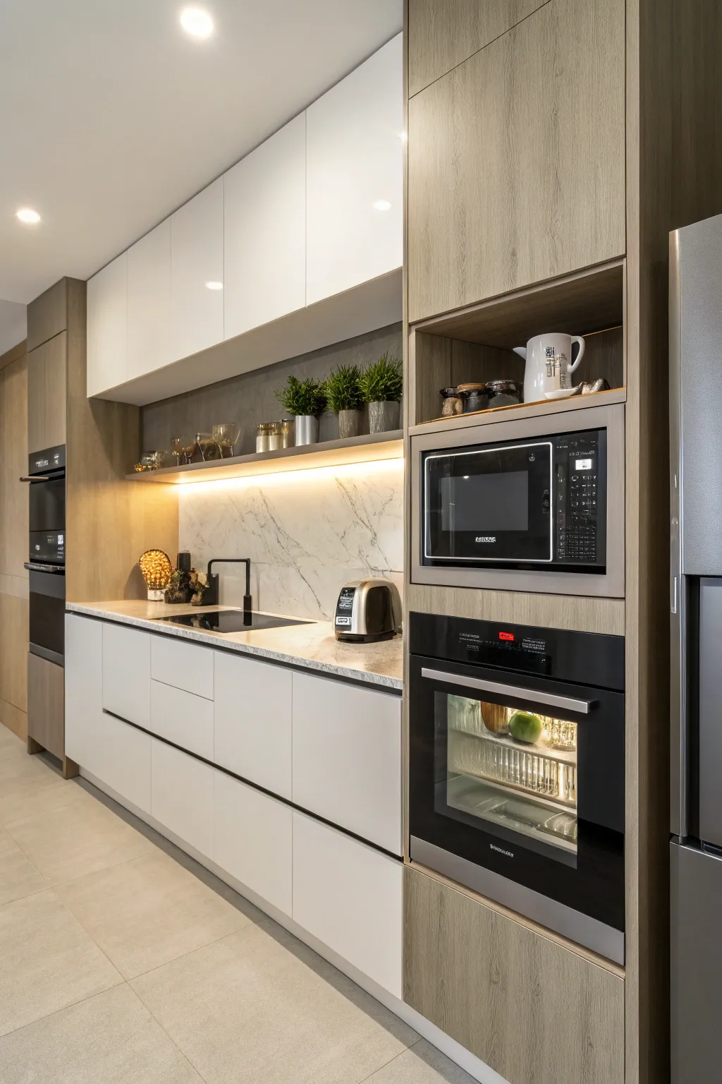 • Small Wave Oven: Optimize corner areas by using a small microwave to mix function with modern kitchen aesthetics.
