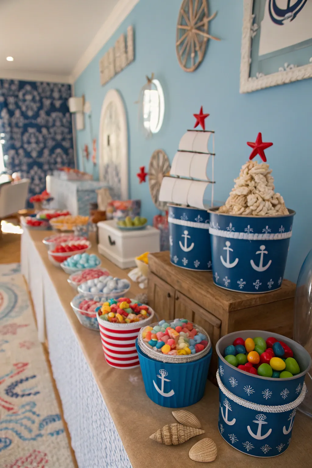 - Marine-Themed Metal Buckets: Elevate your marine-themed gathering with ornamental buckets perfect for holding sweets or favors.