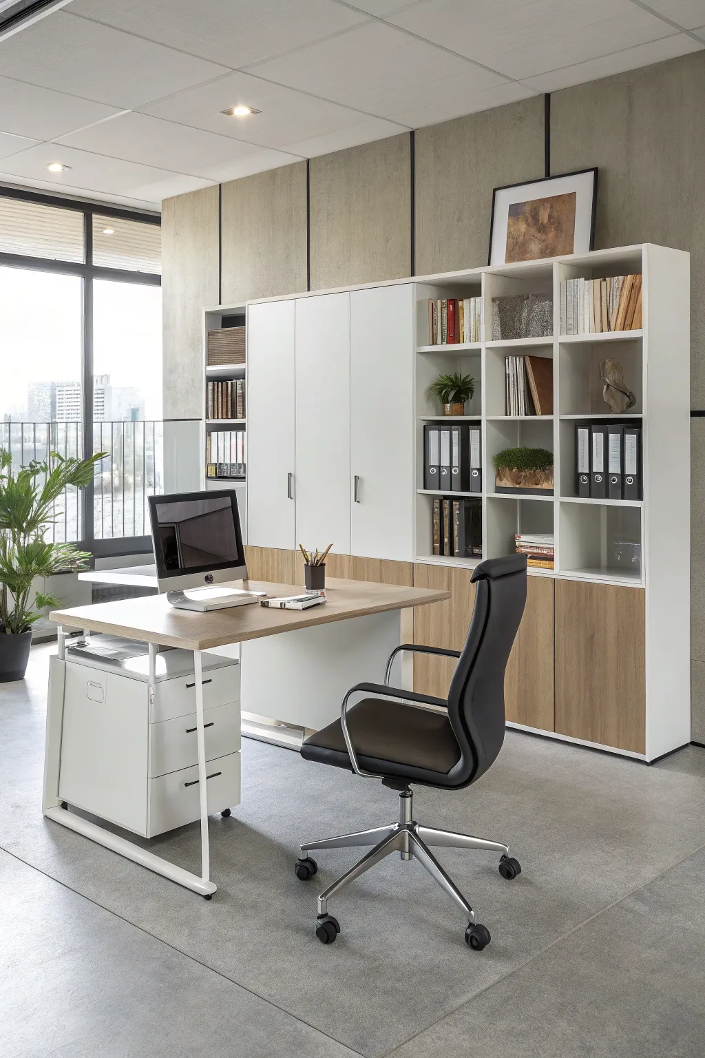 - Contemporary Storage Unit: Organize your storage with a modern storage unit, combining sophistication and usefulness for office decor.