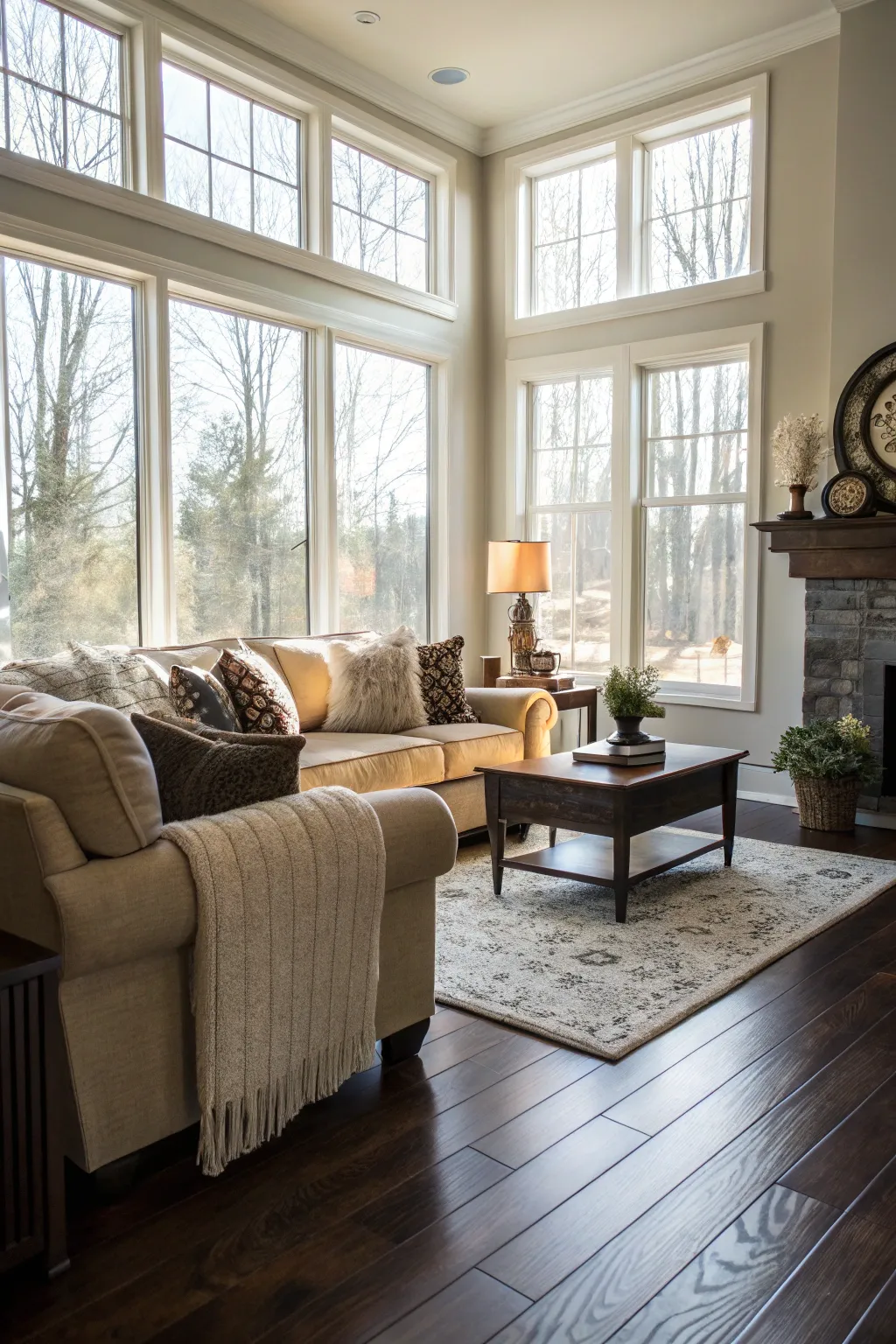 Arrange furniture to create an open and inviting layout. This allows the beauty of the dark wood floors to be fully appreciated.