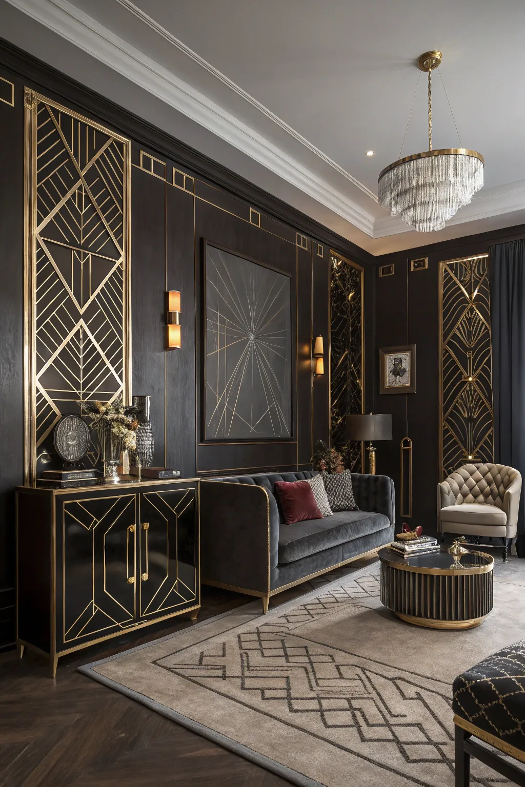 - Gold Accented Geometric Wall Design: Enhance your living space using striking geometric wall design for a daring design statement.