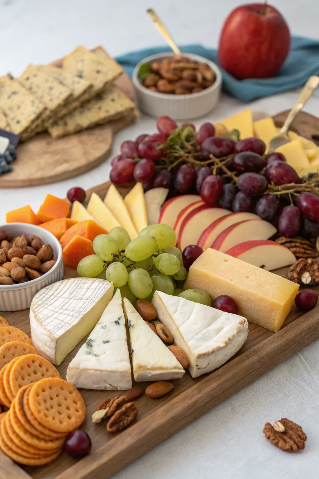 Craft cheese and cured meat boards featuring an assortment of cheeses, fruits, and nuts for an exquisite spread. The trick is to harmonize flavors and colors for a visually striking arrangement.