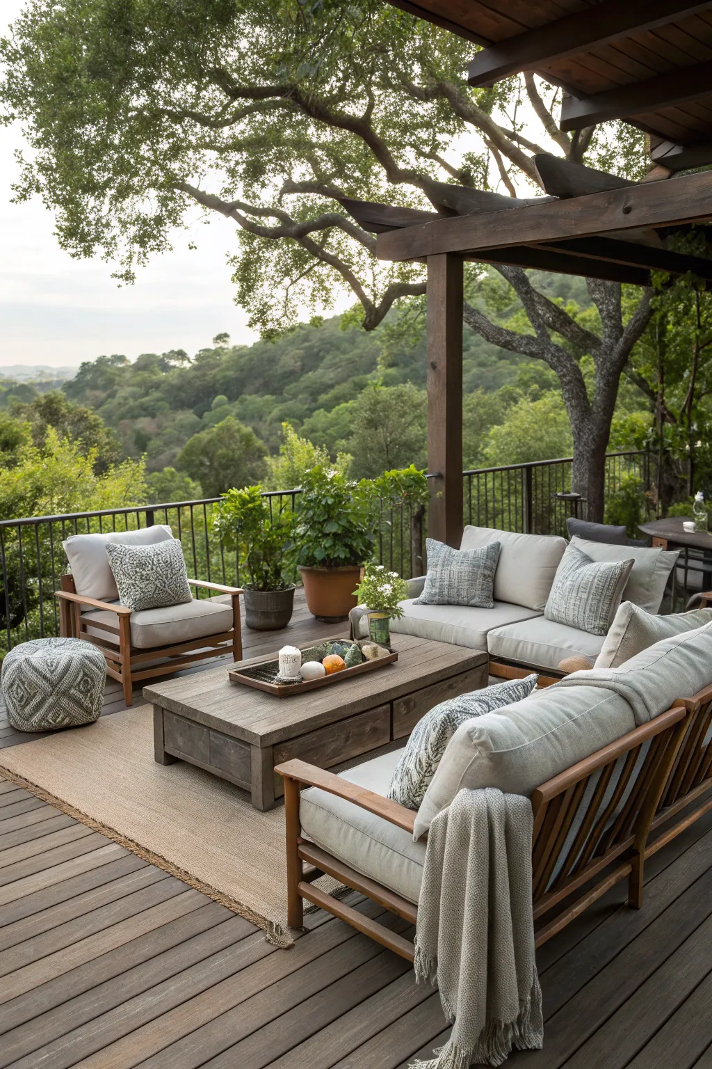 Constructing inviting seating areas with comfortable furniture can turn your deck into the perfect relaxation zone. A cozy couch and a few chairs are my favorite for a perfect spot to unwind.