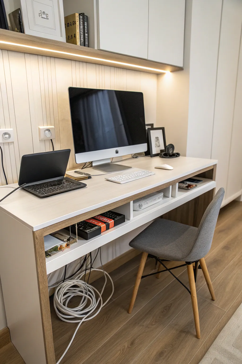 Furniture designed to conceal cables can transform a workspace. I often recommend this solution for a cohesive, integrated aesthetic that minimizes visible clutter.