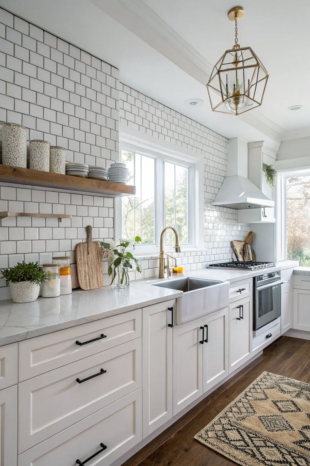 The integration of classic and contemporary elements keeps your kitchen eternally stylish. Consider traditional white panels alongside geometric accents.