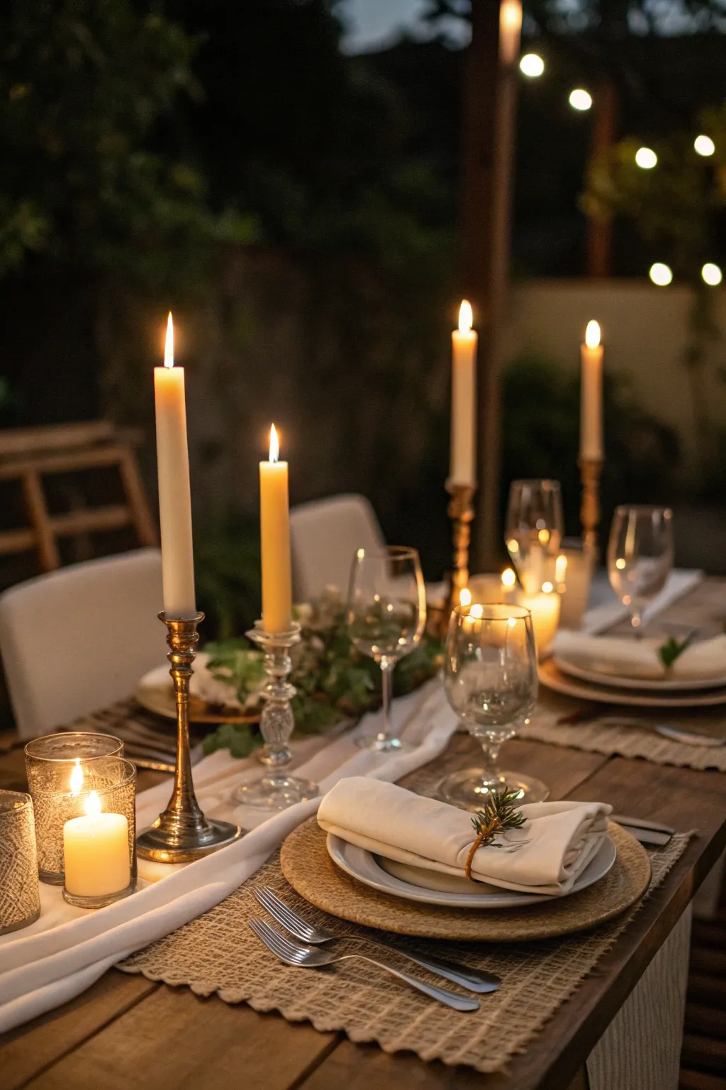 Distribute candles at varying heights to create a cozy and welcoming radiance. For a magical evening ambiance, I once used tall, slender candles combined with small candle holders.