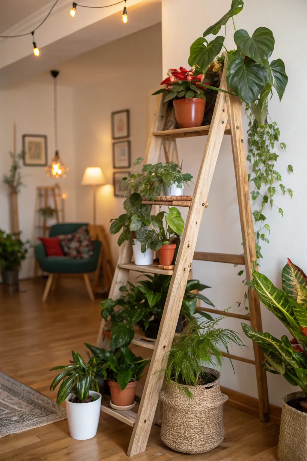 Given my passion for plants, I utilize a ladder as a tiered plant stand. This setup beautifully creates an indoor vertical garden, making your greenery a captivating focal point.