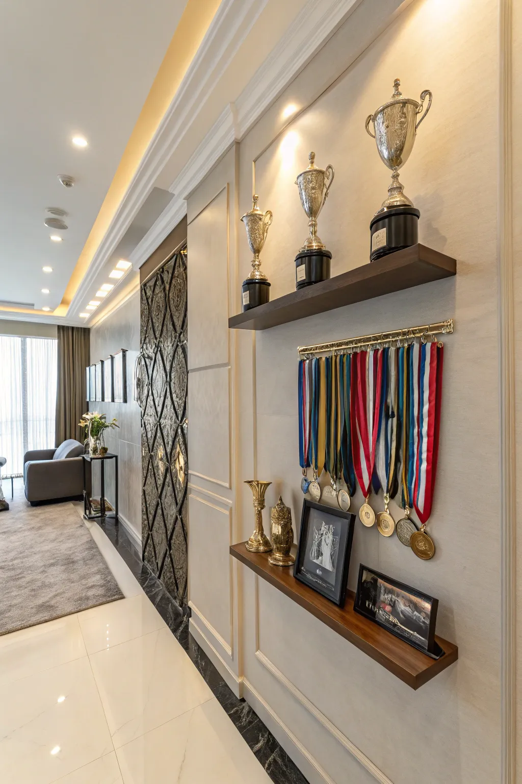 Add hooks or bars under your award shelves to hang medals, creating a lively and captivating display. In my own space, this arrangement adds a pleasant balance and allows each award to shine.