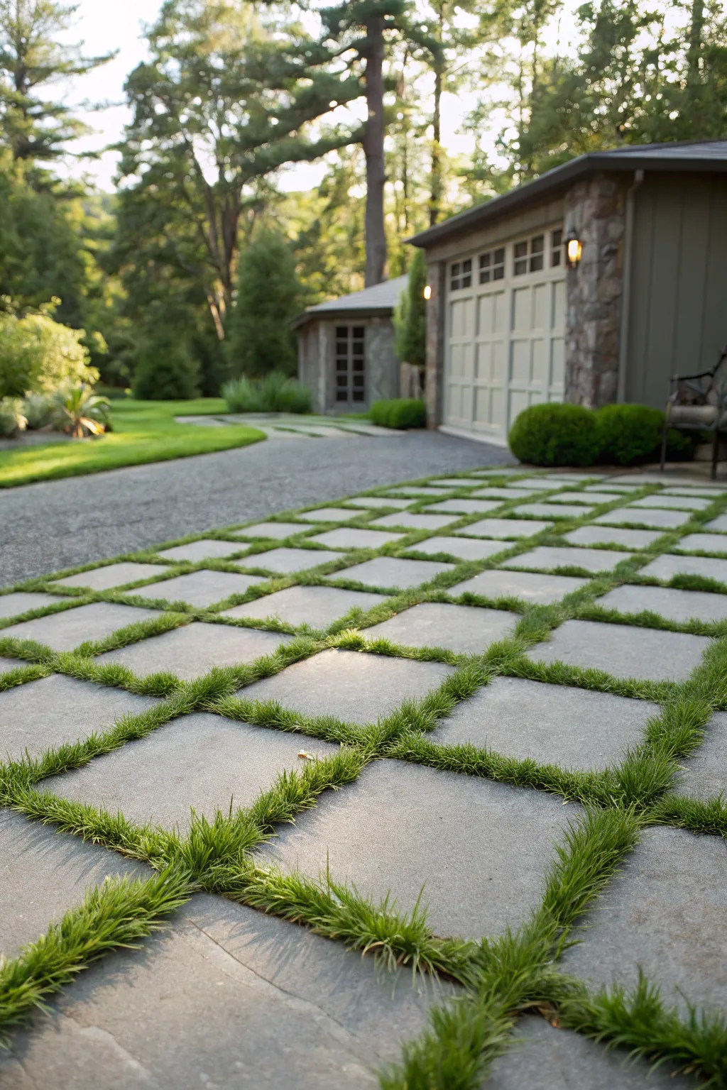 For an unexpected twist, try a green driveway with grass paving. It’s a unique mix of nature and functionality, perfect for eco-minded homeowners.