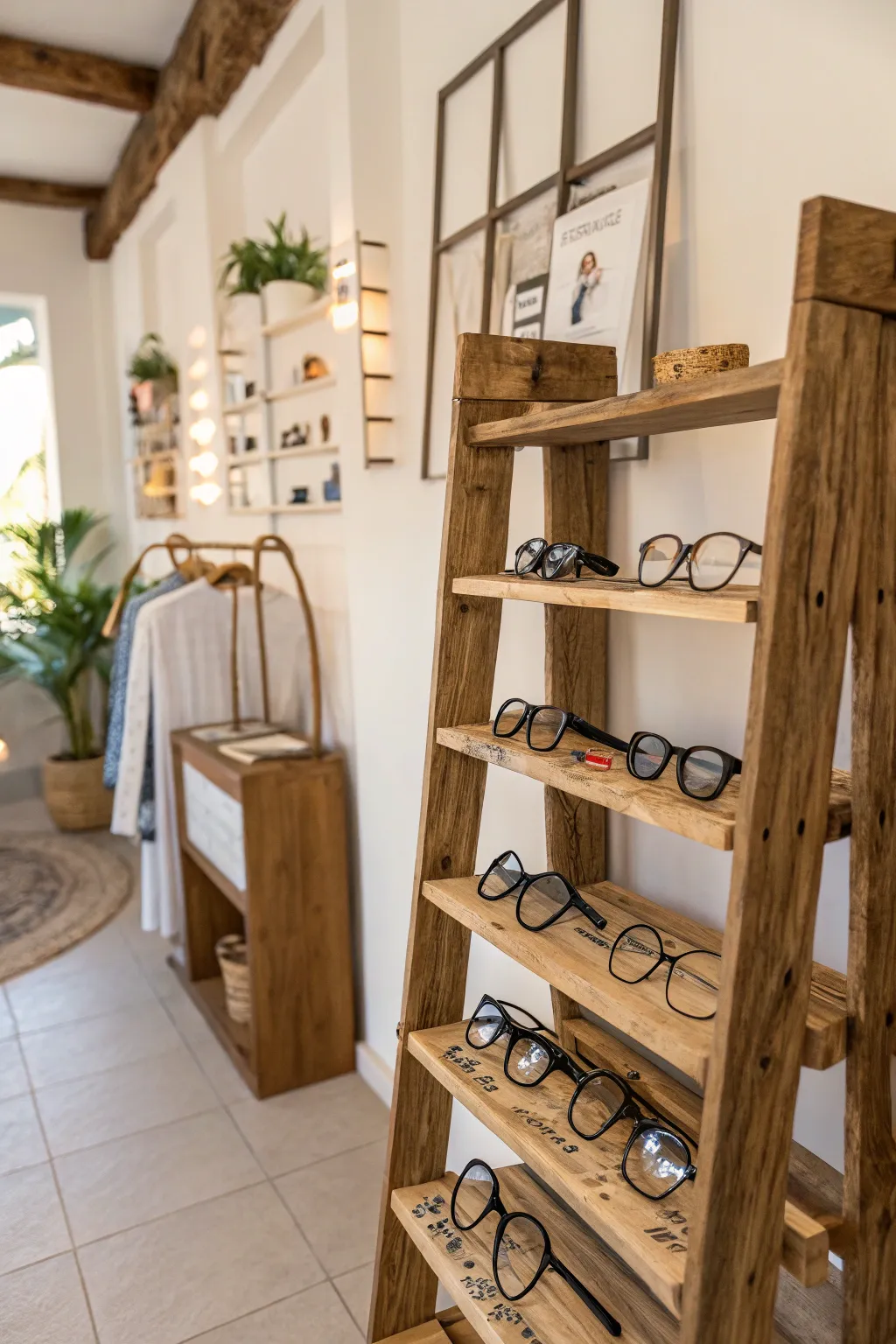 Utilize reclaimed wood racks for a sustainable and fashionable eyeglass display. They provide a cozy, earthy feel that complements various decor styles.