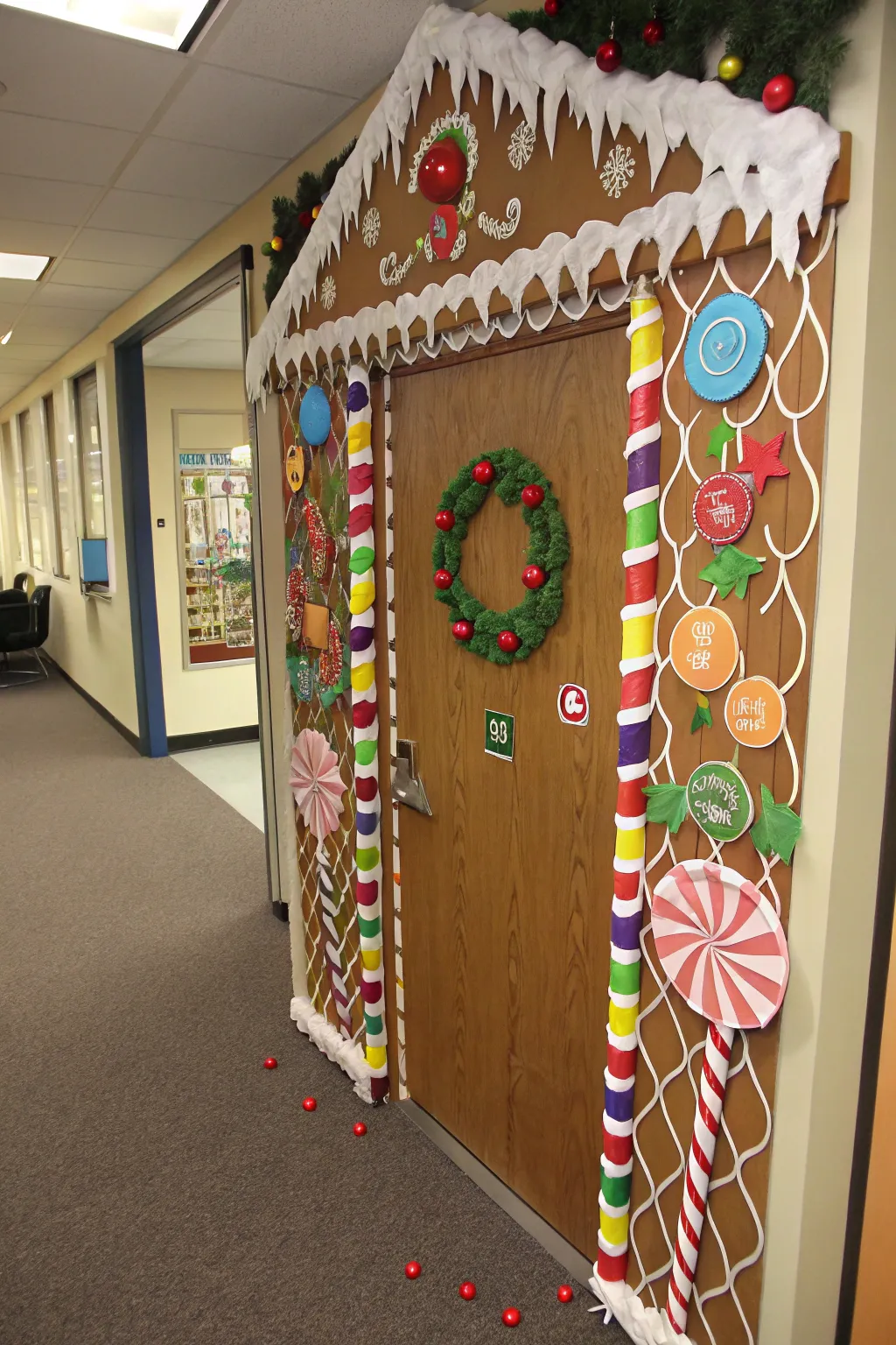 Design your door as a gigantic gingerbread cabin with candy highlights. I enjoy how it smells of gingerbread, utilizing real spices for an aromatic element!