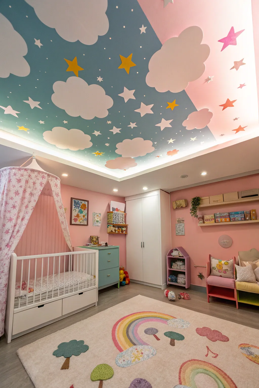 Paint a colorful art on the ceiling to surprise and delight her. This unexpected touch adds a sense of wonder and can be a nightly sky to drift off to sleep under.