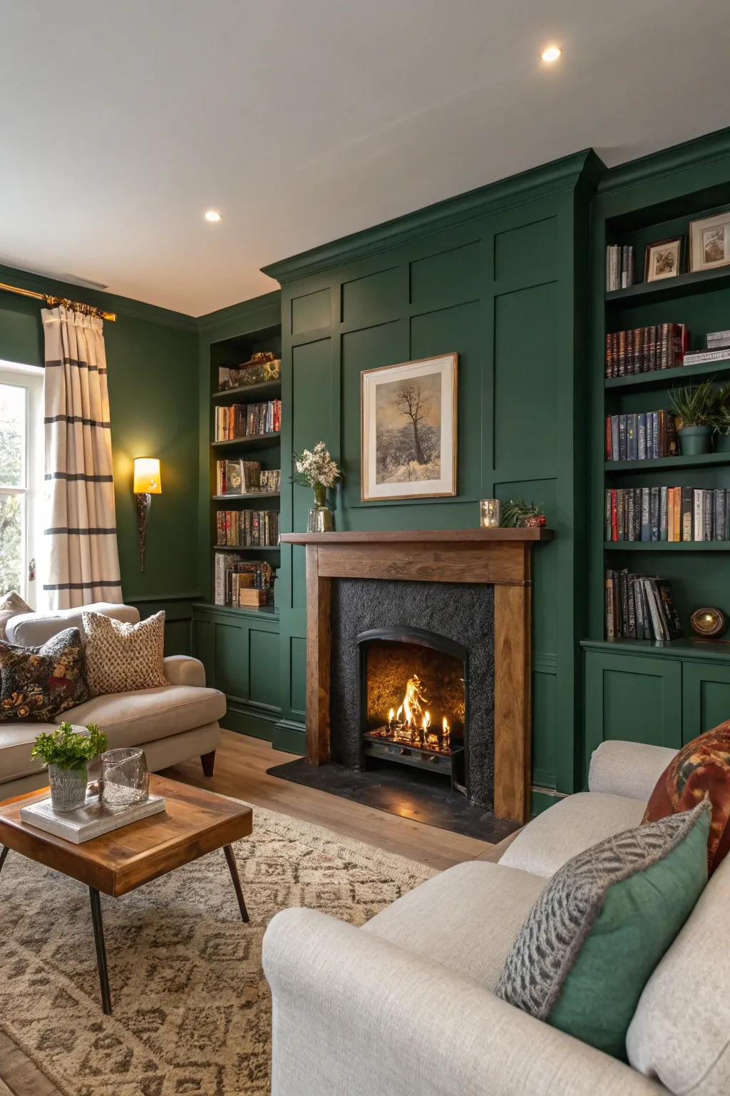 A forest green accent wall behind your fireplace can create depth and drama. It’s a tactic I’ve employed to make the fireplace the focal point of the room.