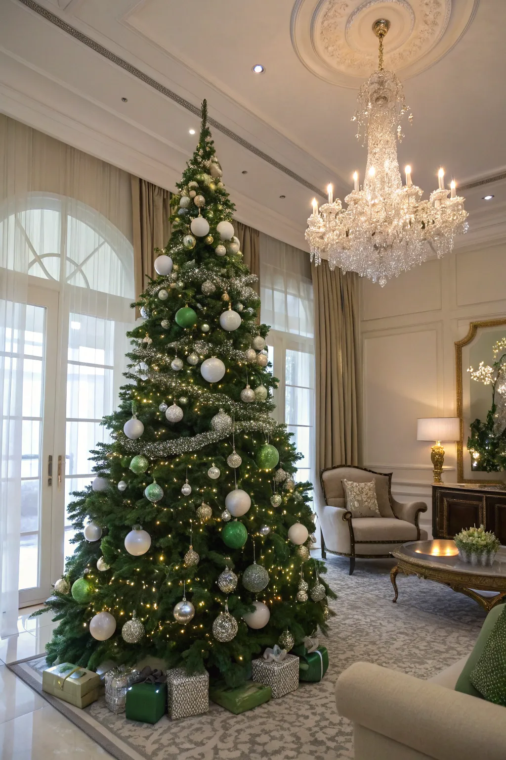 An elegant synthesis of green and white on the Christmas bough.