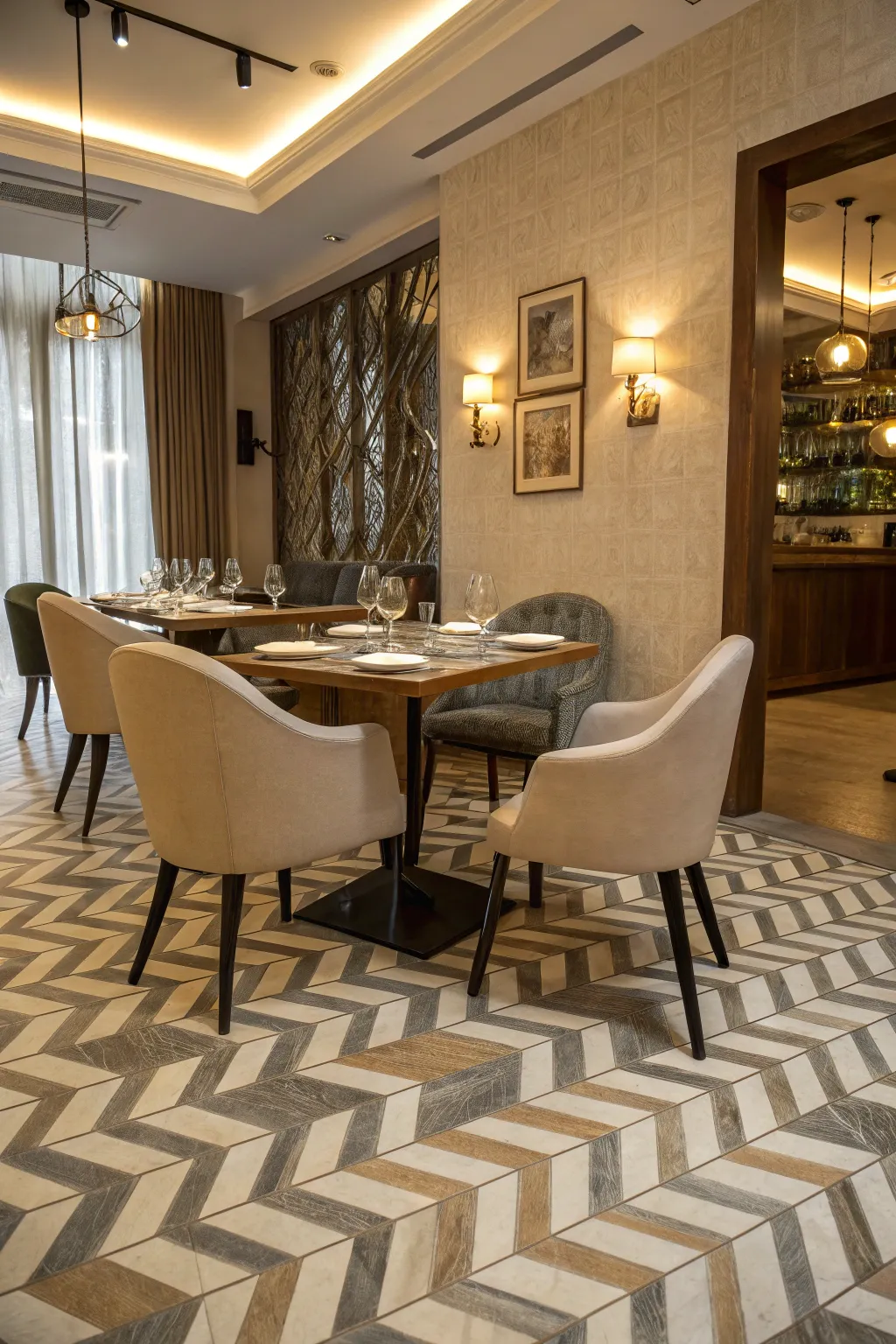 Incorporate designs, such as chevron tiling, to accentuate specific spots like a dining space or reading corner. Designs can attract attention and introduce an artistic element to any space.
