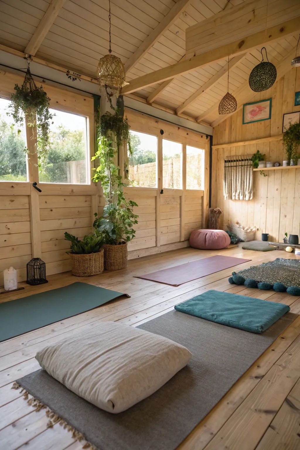 Create a yoga and reflection haven inside your shed, furnished with mats, calming decorations, and serene illumination. This personal retreat can serve as an ideal escape for mindfulness, an encounter I’ve shared with my clients.
