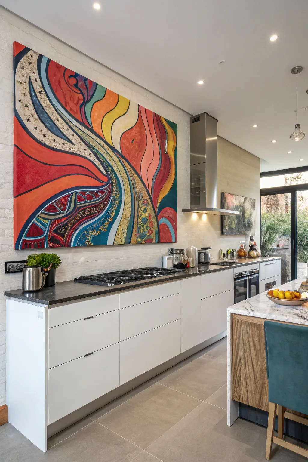 Consider non-representational art for a modern and dynamic feel. A piece with bold colors and flowing lines can change a simple kitchen into a gallery-like area.