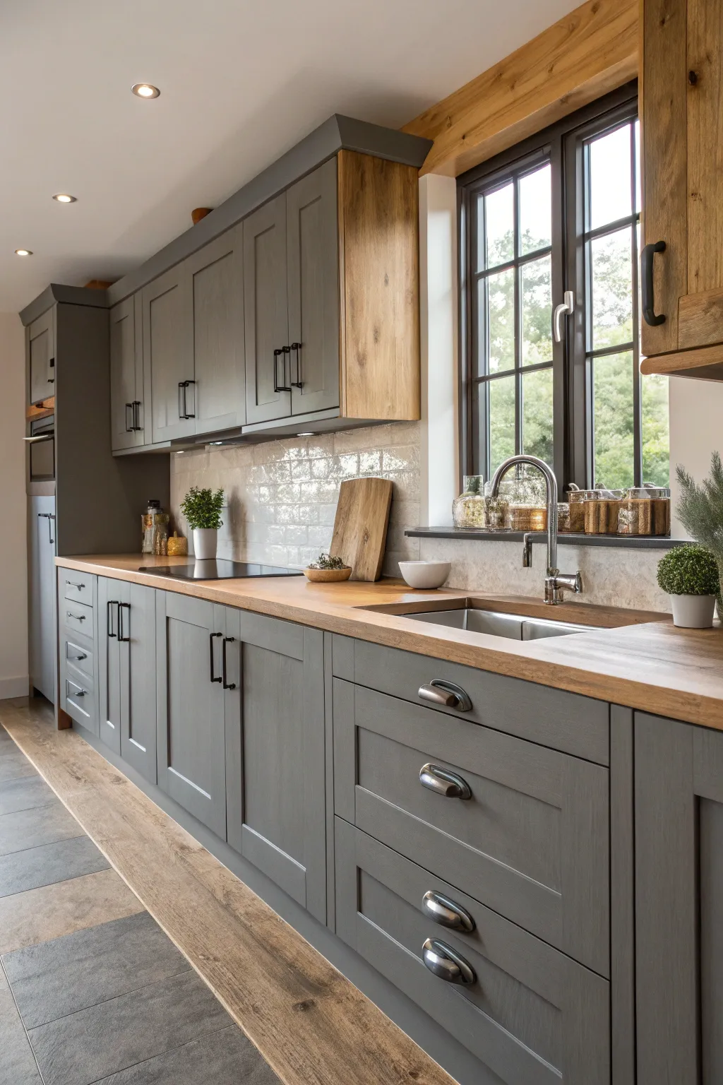 Combine grey cabinets with wooden surfaces for a country touch. This organic element introduces warmth and a cozy vibe.