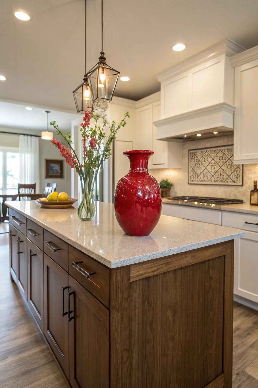- Intense Red Pottery Display: Introduce a striking splash of color with a bold red vase displayed on your kitchen island.