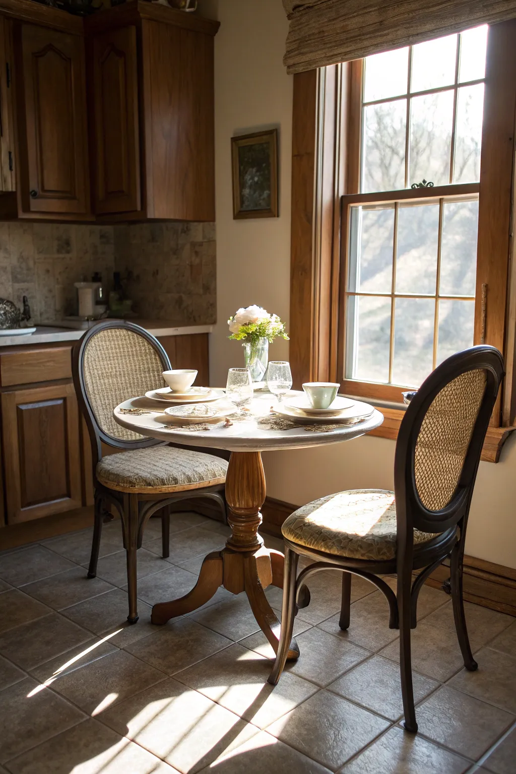A stylish bistro table, perfect for small kitchen spaces.