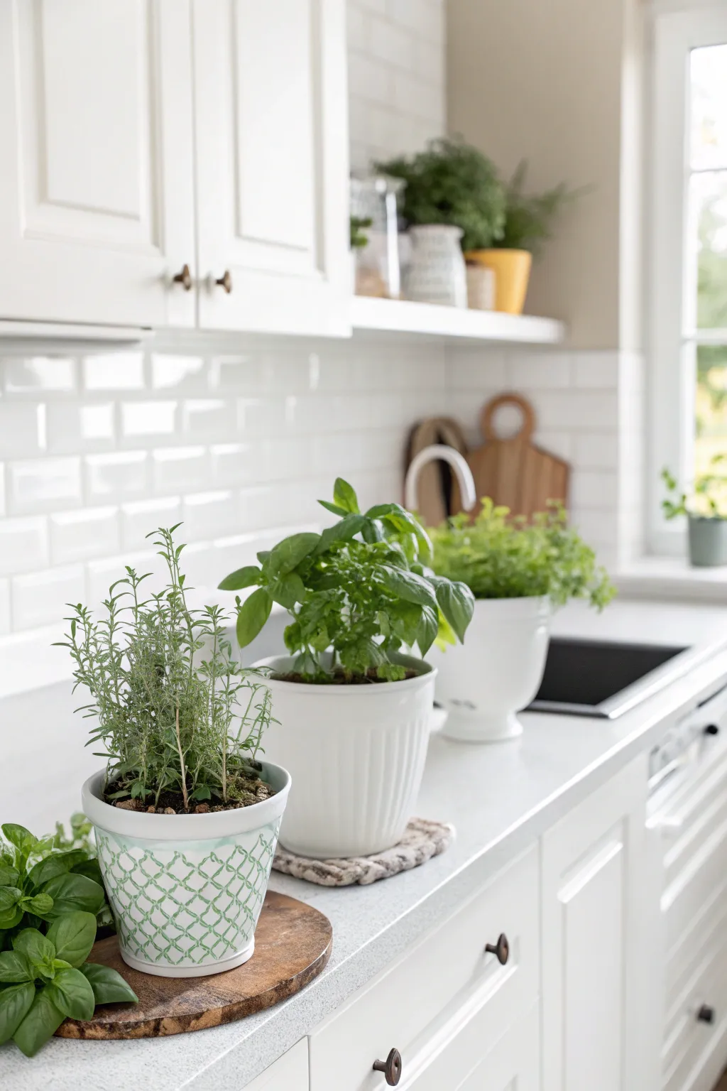 Introducing green elements through plants or herbs can breathe life into a white kitchen. I recommend adding a few potted plants on the windowsill or countertop for a natural, refreshing touch.