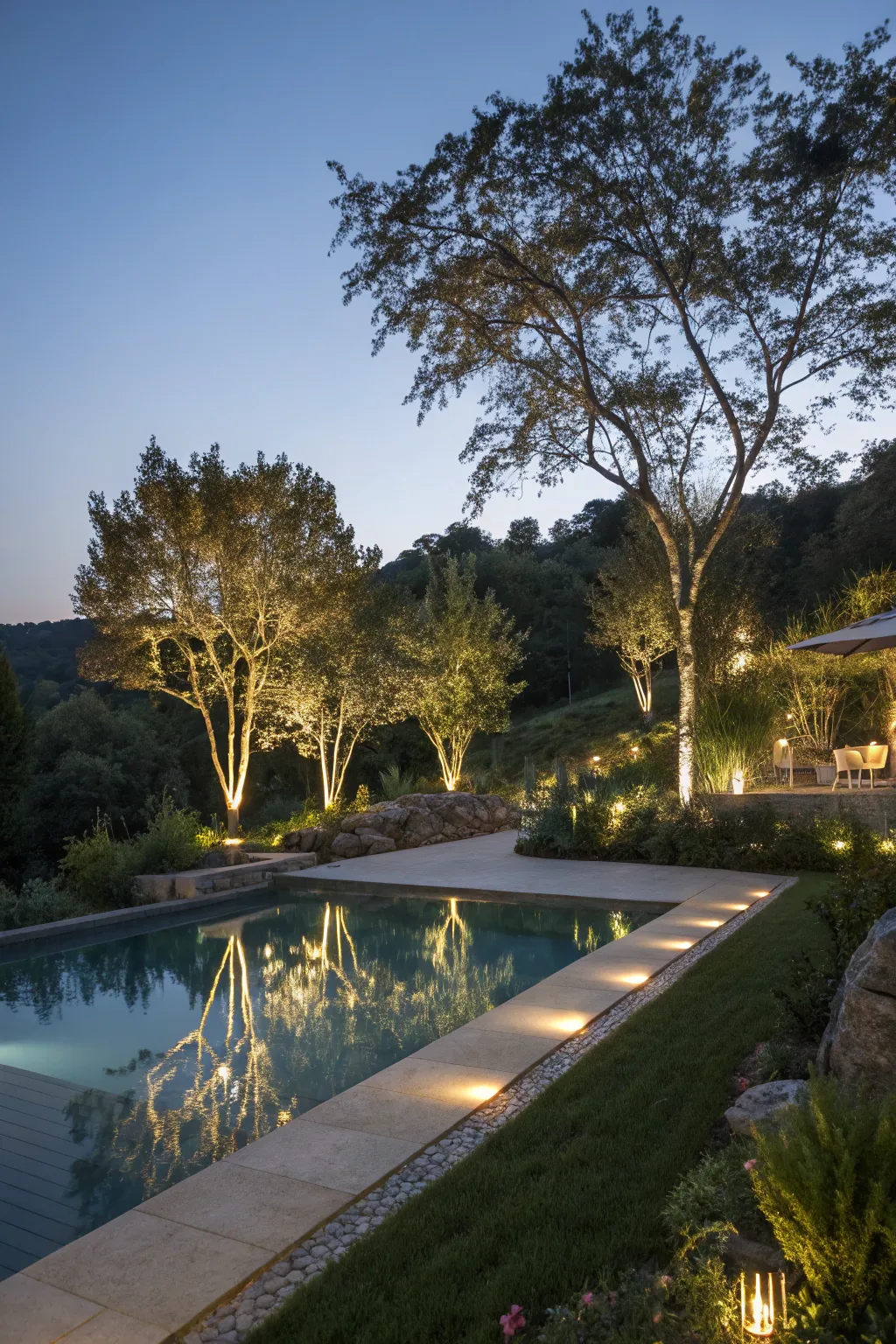 Use garden lighting to emphasize plants and trees surrounding your pool. This technique combines your pool into the garden, making a seamless outdoor retreat.