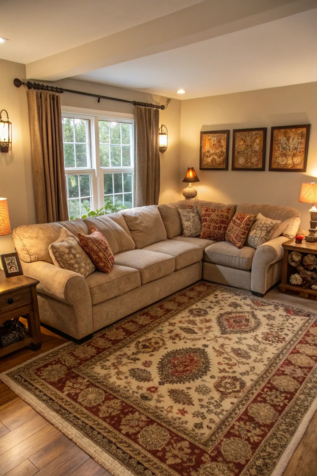 - Traditional Area Rug: Improve the warmth of your living room with a traditional rug to complement your cozy decor effortlessly.