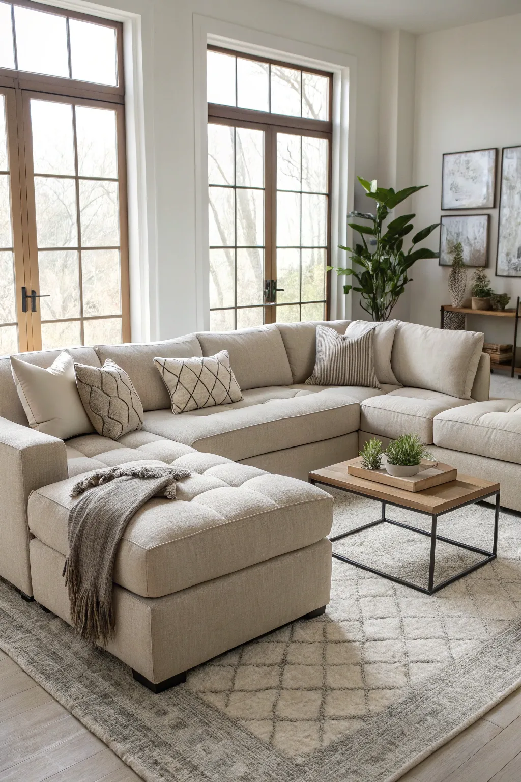 • Designed Rug: Create a warm ambiance with a patterned rug that complements your sectional’s neutral tones.