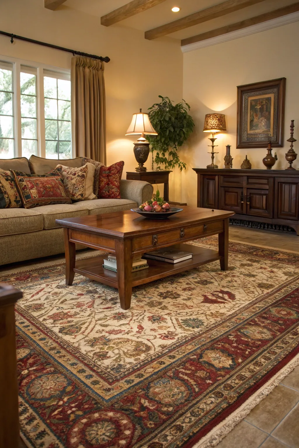 Use a prominent rug to anchor your living space. A Persian or traditional-style rug can add color and pattern, grounding the area beautifully.